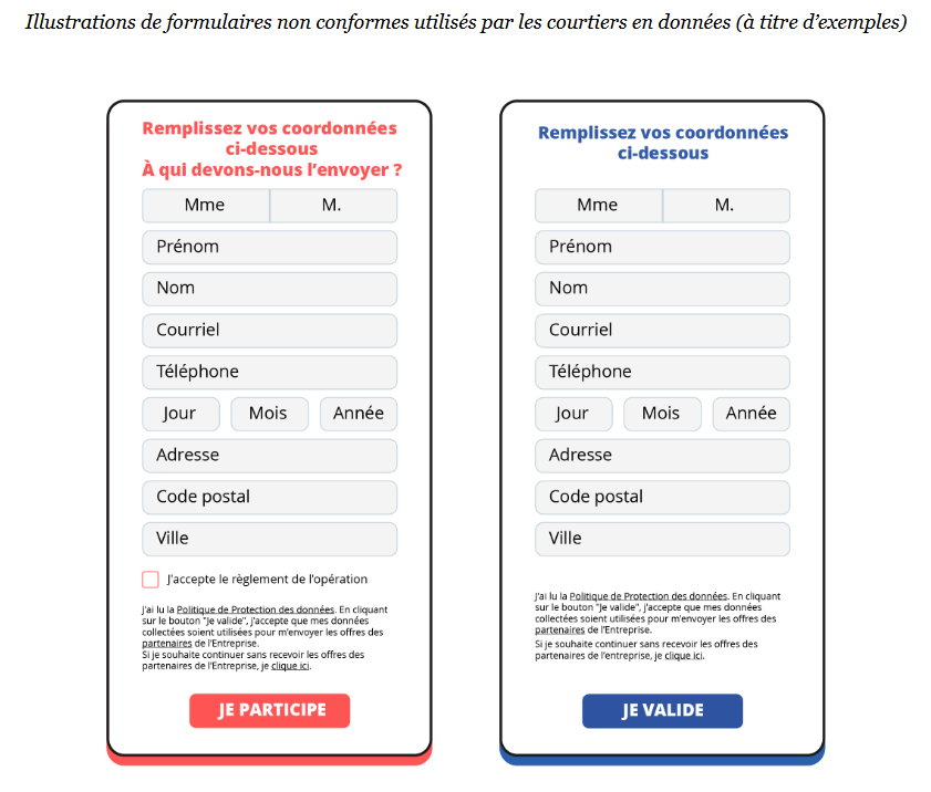 La CNIL a sanctionné les interfaces à "bouton unique" de type « JE PARTICIPE » ou « JE VALIDE » et les interfaces manipulatoires. En effet, le design pousse les utilisateurs à consentir sans réflexion, ou sans même percevoir qu’ils donnent leur accord pour être prospectés (Points 65-66-69).