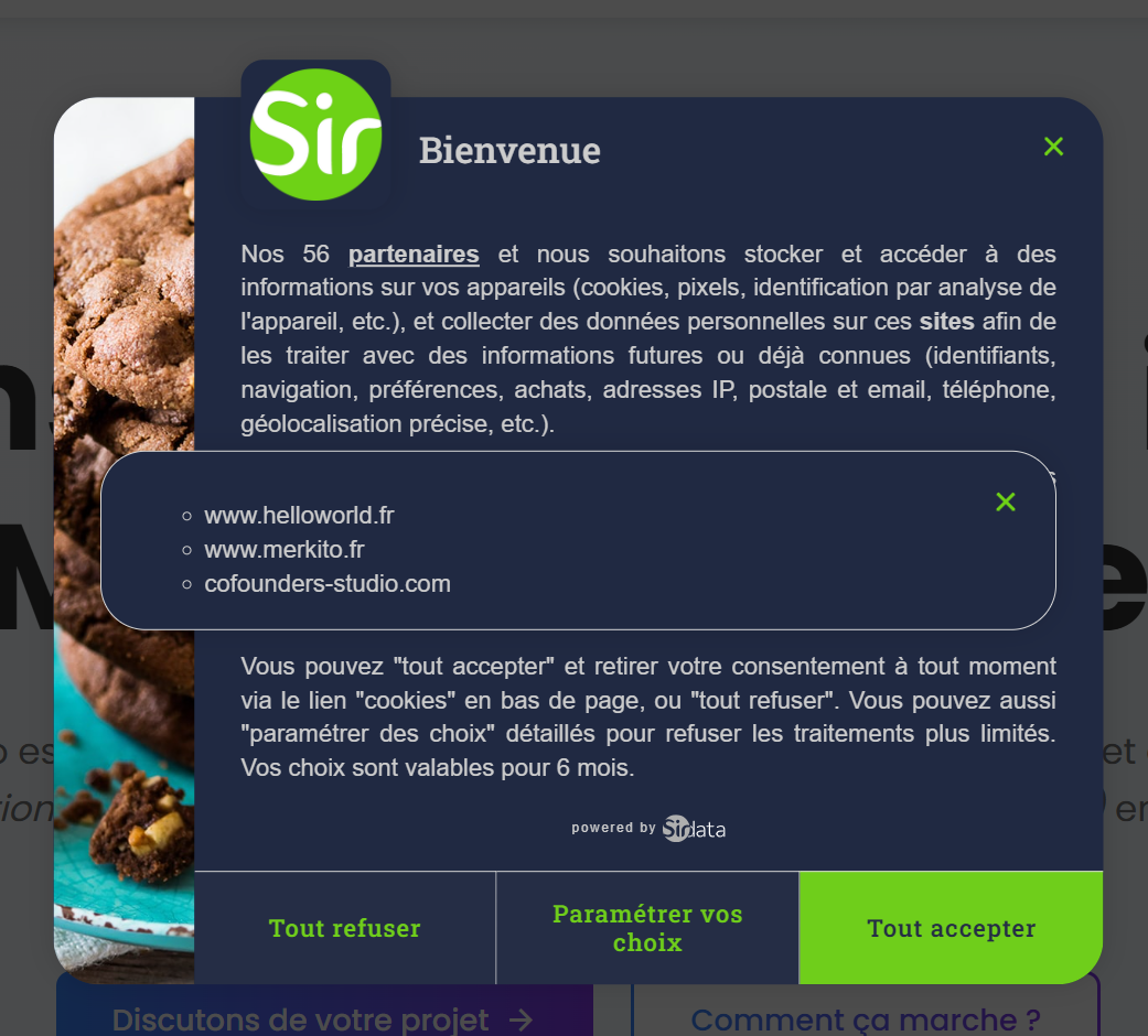 Il sâagit de la fenĂȘtre de dialogue qui sâaffiche Ă lâarrivĂ©e sur un site pour collecter les choix des internautes en matiĂšre de vie privĂ©e.