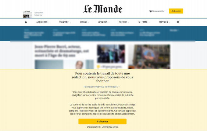 C’est notamment l'approche intéressante de l’Obs et Le Monde, qui affichent sur leurs sites un large bandeau pédagogique afin de couvrir un tiers de la page web sur ordinateur et sur mobile lorsque l’utilisateur ne souhaite ni s’abonner ni ne consentir à l’utilisation de ses données personnelles à des fins publicitaires.