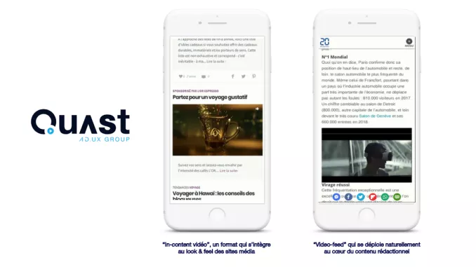 Native advertising, can be a non intrusive and user friendly format, increases by 27% in 2018 compared to 2017. Video for it’s part benefited from a +47% growth in investments in France. 2018 vs. 2017 (SRI observatory of the e-pub year 2018). By 2022, it will account for 80% of all Internet traffic (Cisco 2018 study). With this in mind, AdUX is launching Quast which combines these two formats in the service of a user experience always valued. Explains the company in a statement.