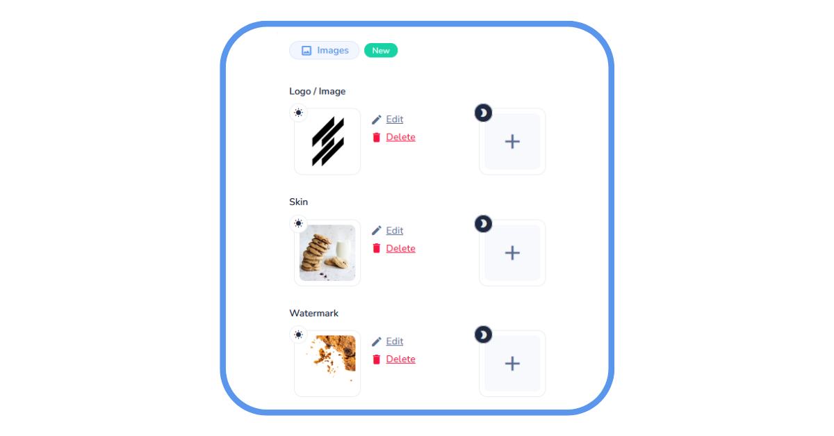 - Adding Userfriendly and customizable visuals: in addition to the main image (or logo), you can now integrate a dressing and/or a watermark: