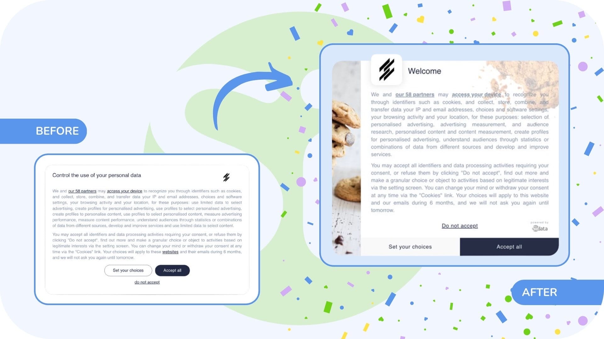 - Unchanged settings: your logo, your colors, the choice of refusal mechanics or the list of partners are kept!