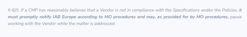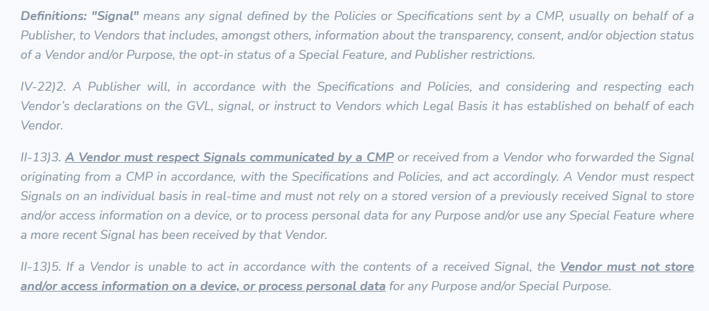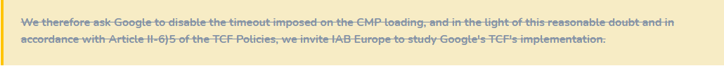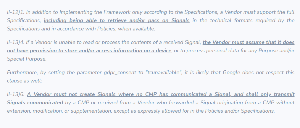 We also believe that by interrupting the process before the CMP is loaded and thus not receiving consent status, Google is in breach of the TCF Policies and in particular these articles: