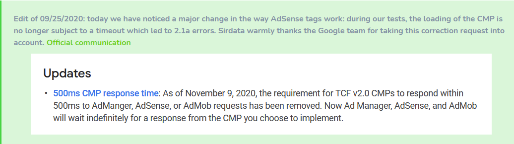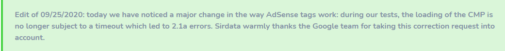 It is in this context that, to our knowledge, many publishers, using a CMP compatible with TCF v2, have received alerts from Google in their AdSense or Ad Manager console.