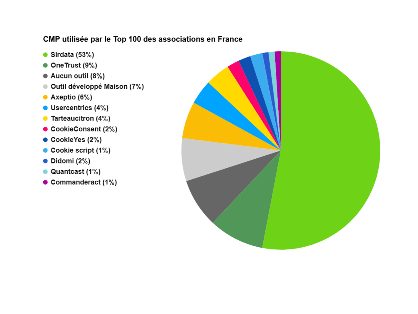 Avec 53 % d’adoption, la CMP développée par Sirdata s’impose comme la solution la plus utilisée dans le secteur associatif français. Loin derrière, One Trust et Axeptio complètent le podium avec respectivement 9 % et 6 % de parts de marché. Ce classement témoigne d’un net plébiscite pour Sirdata, dont la stratégie d’accompagnement solidaire semble porter ses fruits.
