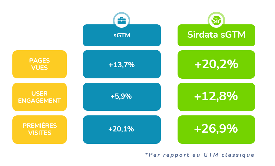 Les rĂ©sultats via sGTM avec option GTM Helper proposĂ©e par Sirdata ont dĂ©passĂ© ceux de l'hĂ©bergement avec CDN seul, en enregistrant une augmentation de 20,2% des pages vues et une hausse de 12,8% de l'engagement utilisateur. Les traitements supplĂ©mentaires rendus possibles par lâoffre complĂšte Sirdata rend donc un hĂ©bergement GTM Server-Side deux fois plus performant, notamment grĂące Ă un meilleur dĂ©sadblocking.