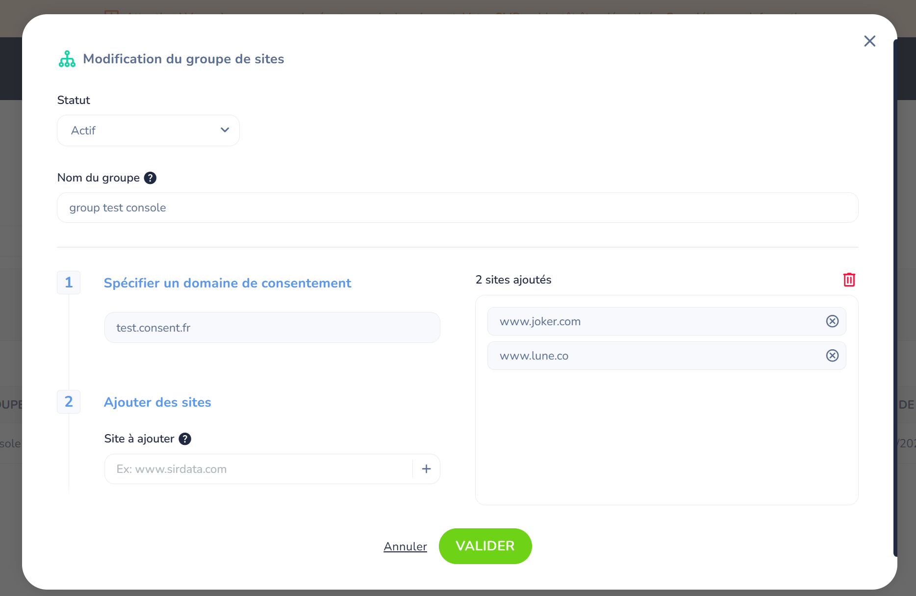 La création d’un groupe de sites se fait en quelques étapes : il suffit de définir un nom de groupe, de sélectionner un domaine de consentement et d’ajouter au minimum un site, au format valide. Une fois créé, le groupe peut être modifié ou supprimé à tout moment depuis la console.