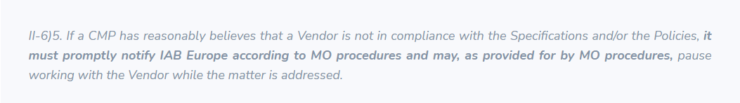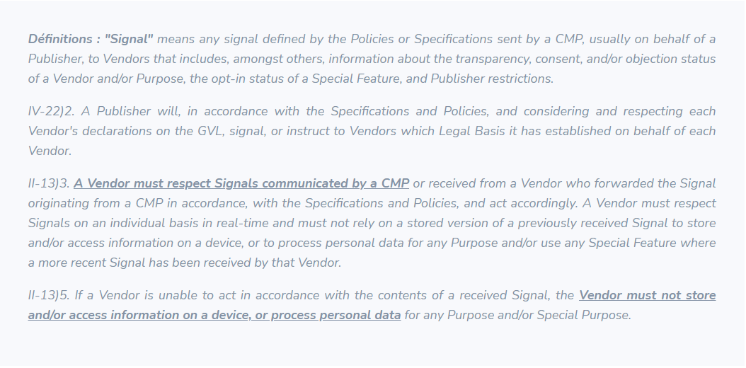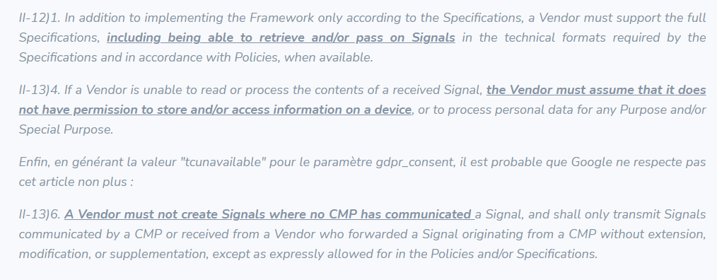 Nous estimons également qu'en interrompant le processus avant le chargement de la CMP et en ne recevant ainsi pas le statut de consentement, Google ne respecte pas les Policies du TCF et en particulier ces articles :