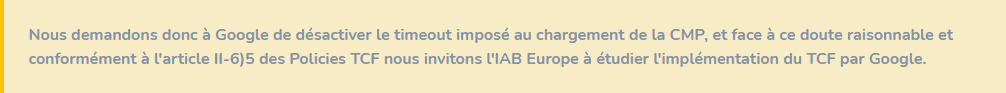 Il ressort de nos investigations que Google a semblé préférer l'efficacité au respect du choix de l'utilisateur en paramétrant un timeout de 500 millisecondes pour le chargement de la CMP parmi tous les scripts de la page : au bout de ce délai, le script mentionné au premier point (adsbygoogle.js) coupe le processus et renvoie l'erreur tcfe=1 et la valeur "tcunavailable" pour le paramètre gdpr_consent.