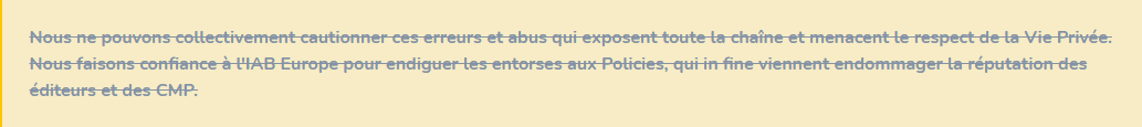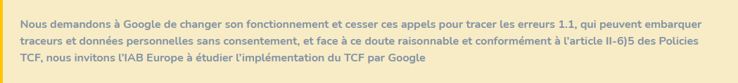 Dans nos propres développements, nous priorisons l'intérêt de l'utilisateur. Ce qui nous confère une certaine habileté dans la compréhension et la mise en œuvre des interactions entre technologie et vie privée. Nous aurions apprécié être informés de ces protocoles de tests que nous jugeons mal formulés lorsque nous avons préparé l'arrivée de Google à l'occasion de la transition vers la v2 du TCF.