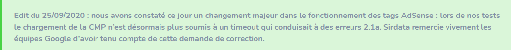 Edit du 25/09/2020 : nous avons constaté ce jour un changement majeur dans le fonctionnement des tags AdSense : lors de nos tests le chargement de la CMP n’est désormais plus soumis à un timeout qui conduisait à des erreurs 2.1a. Sirdata remercie vivement les équipes Google d’avoir tenu compte de cette demande de correction. Communication officielle